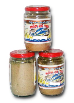 mắm cá thu bốc mùi, có nước ở mặt trên trong lọ, đổi màu thì không nên dùng nữa.